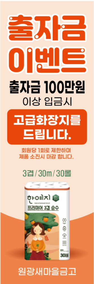출자금 통장에 100만 원 이상 입금하시면 고급 화장지를 선물로 드립니다